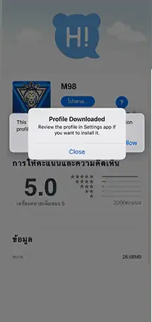 - เข้าสู่ระบบ M98 กดที่ปุ่มดาวน์โหลด iOS แล้วกด ‘ติดตั้ง’ เมื่อระบบแจ้ง