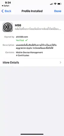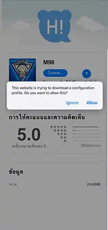 - เข้าสู่ระบบ M98 กดที่ปุ่มดาวน์โหลด iOS แล้วกด ‘ติดตั้ง’ เมื่อระบบแจ้ง